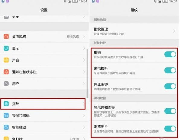 进入华为手机的“设置”后,再点击“指纹”功能,里面分别提供“拍摄”、“来电接听”、“停止闹钟”、“显示通知面板”以及“浏览图片”等5个基本功能,花粉们可以根据个人喜好打开相应的选项。